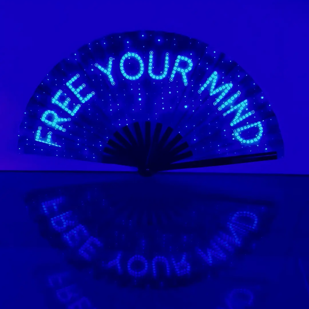 Este abanico tiene tecnología ultravioleta que brilla con la luz neón.