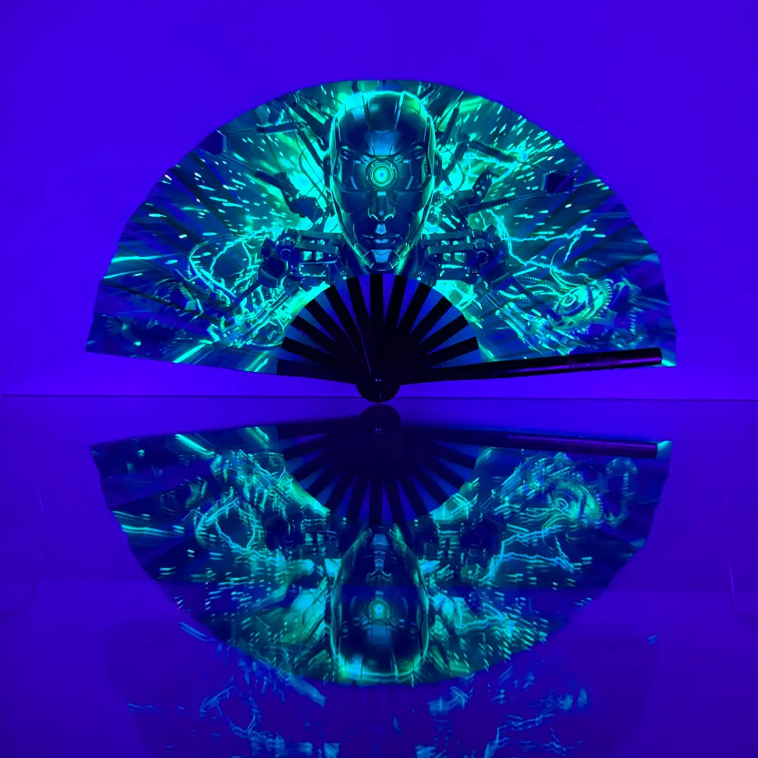 Este abanico tiene tecnología ultravioleta que brilla con la luz neón.