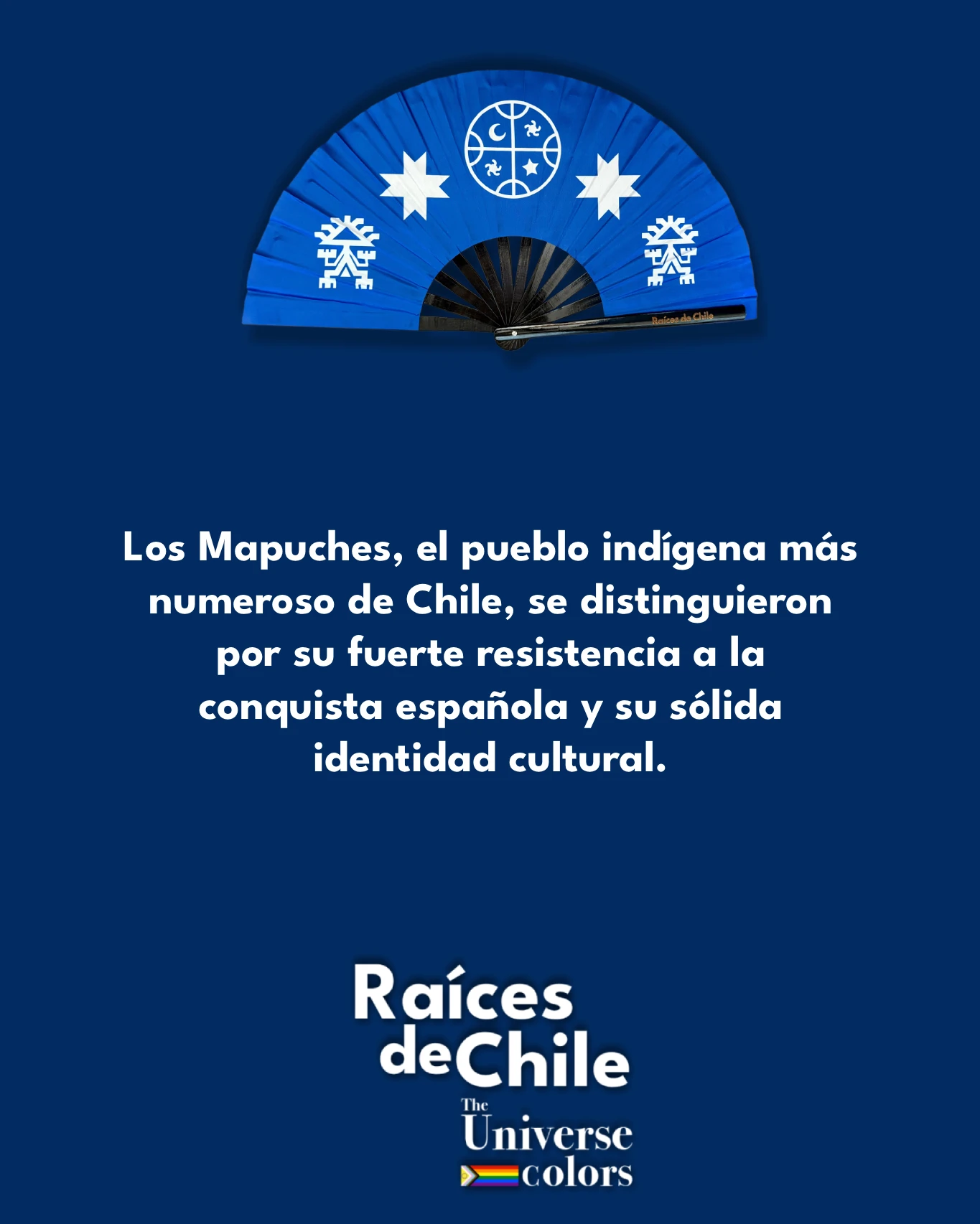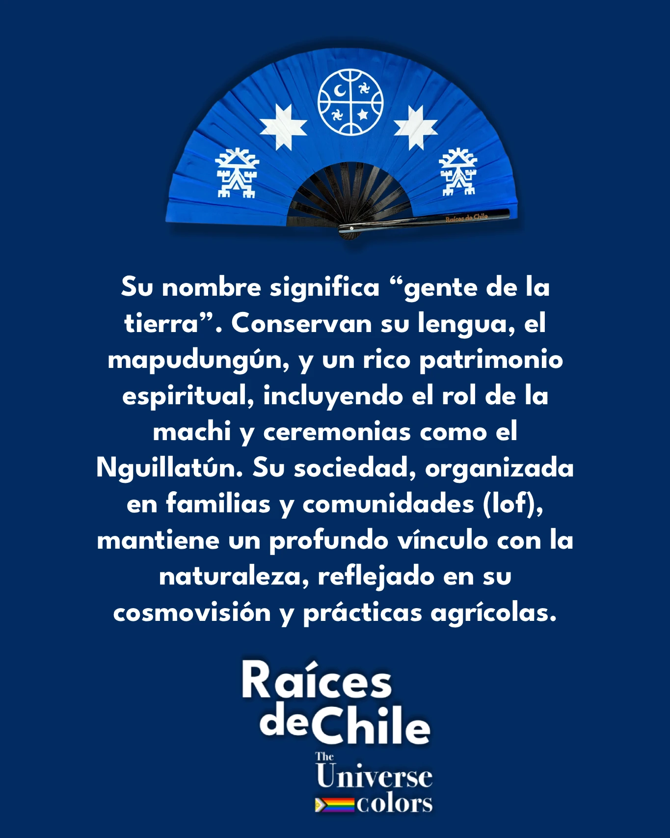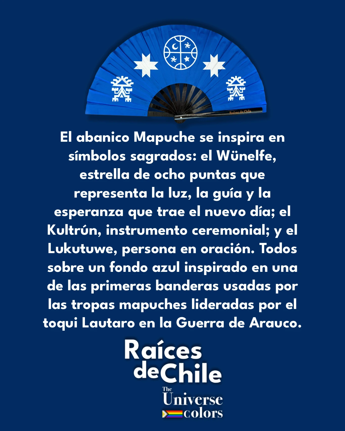 El abanico Mapuche se inspira en símbolos sagrados: el Wünelfe, estrella de ocho puntas que representa la luz, la guía y la esperanza que trae el nuevo día; el Kultrún, instrumento ceremonial; y el Lukutuwe, persona en oración. Todos sobre un fondo azul inspirado en una de las primeras banderas usadas por las tropas mapuches lideradas por el toqui Lautaro en la Guerra de Arauco.